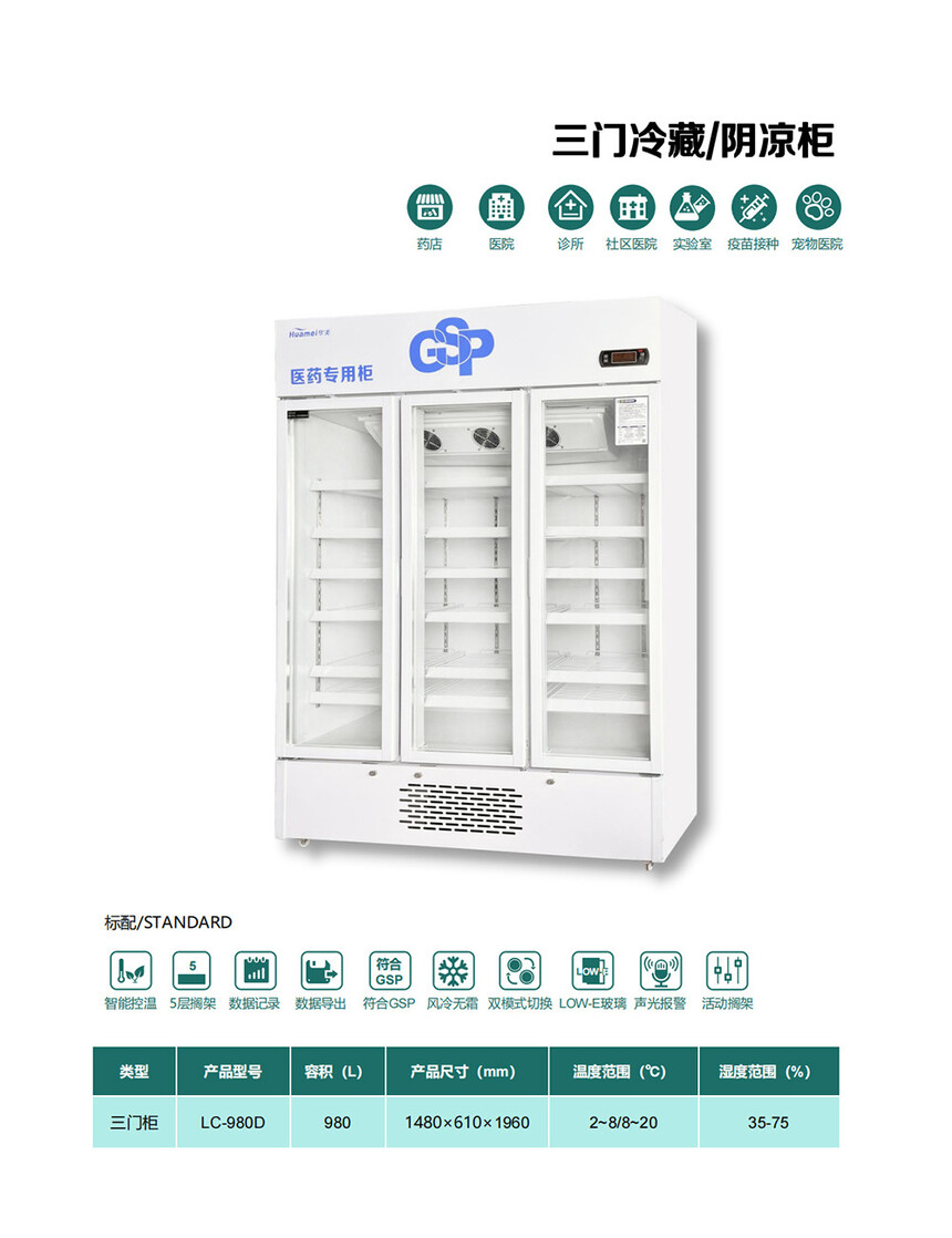 帶注冊證華美三門醫用陰涼柜試劑冷藏冰箱藥房藥品柜風冷無霜LC-980D